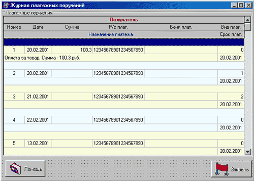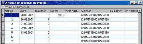 Интересно организовано перемещение по строкам и столбцам - а-ля 1C-Бухгалтерия версия 6. В нашем случае выделено поле "Получатель". Если нажать клавишу вниз, то станет активной следующая запись и тот же столбец, а при нажатии клавиш влево или вправо происходит перемещение по строке на предыдущее или следующее поле.